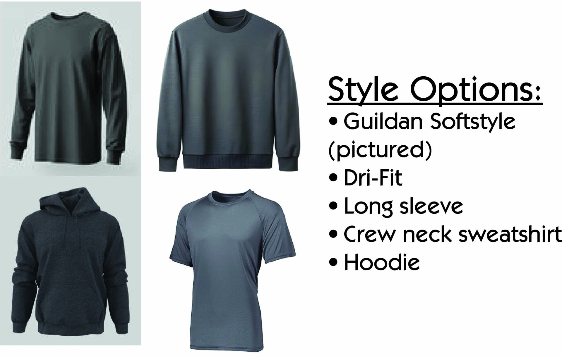 Gildan softstyle t-shirts, long sleeve, crewneck, hoodies, and Dri-fit Just Cool. This particular design comes in charcoal gray with a red and white design on the front while including a football icon within the design.