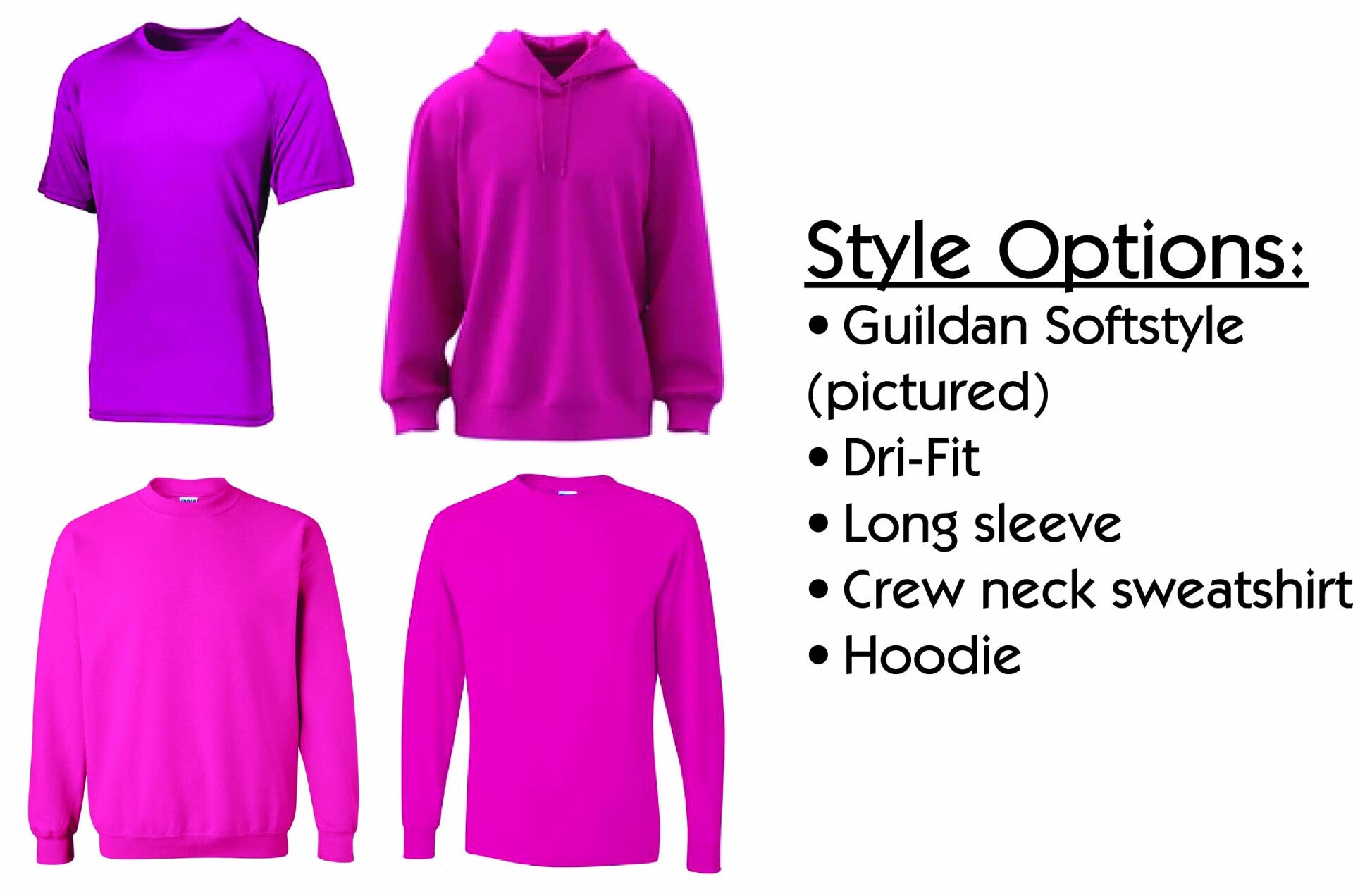 Gildan dri-fit, softstyle t-shirts, long sleeve, crewneck, and hoodies. This particular design comes in pink with a navy and white design on the front.