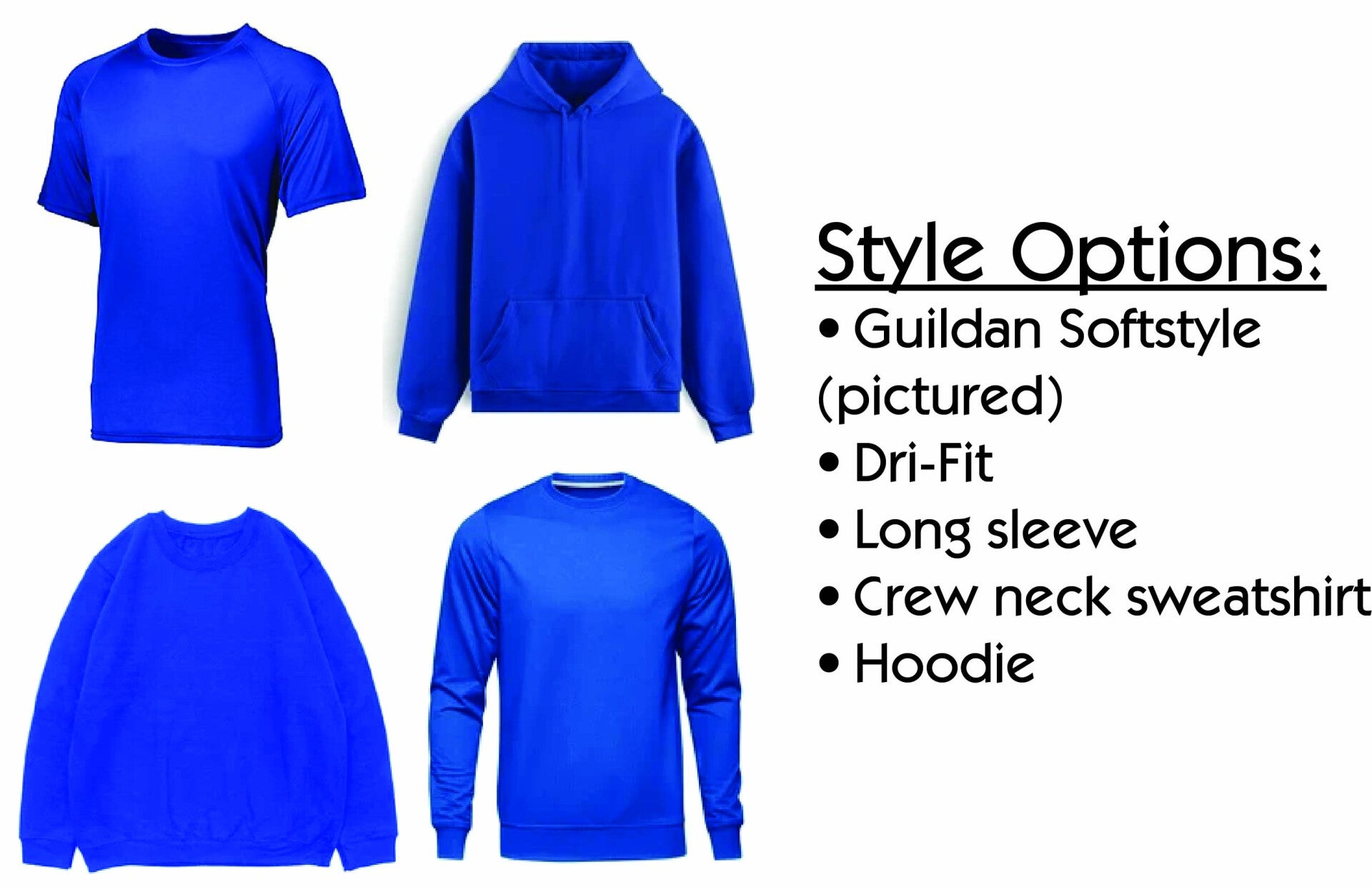 Gildan dri-fit, softstyle t-shirts, long sleeve, crewneck, and hoodies. This particular design comes in royal blue with a blue and white design.